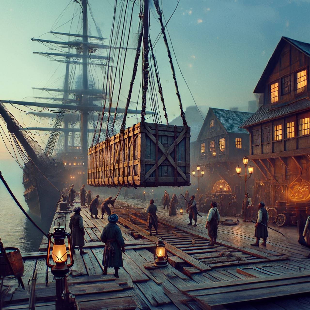 Drifmar harbor is a sight to behold, sprawling out in a wide arc cradled by the city like two protective arms. Its waters, deep and treacherous in places, are calmed by a massive breakwater that stretches across the mouth of the crescent-shaped bay. This stone barrier, weathered by countless storms, shields the ships anchored within from the worst of the ocean’s fury. At the farthest edges of the bay, on the outermost points, stand two lighthouses, their twin beacons casting long fingers of light across the water, guiding vessels safely into the harbor. As dusk falls, the bay comes alive with the glow of lanterns, reflecting off the surface of the water like a thousand dancing stars. Running through the heart of Driftmar and flowing into the sea from the east is the Sylrune River. Barges laden with goods glide along its waters, making the river a crucial trade route that connects Driftmar to inland towns and regions. The riverbanks are lined with warehouses, bustling docks, and smaller markets that cater to traders who prefer to bypass the busy harbor. The Sylrune enters the city through a gated opening in the tall city wall, above which stands a guard tower, ever vigilant over the flow of commerce coming in and out of the city. Tonight, the harbor and river docks are particularly busy. Ships from distant lands have docked, their decks laden with goods from across the seas. Among the usual crates of spices, silks, and exotic wares, one shipment stands out—a very large, heavy, long, and narrow crate that has drawn the attention of more than a few curious onlookers. Its contents remain a mystery, but its arrival has already sparked whispers among the dockworkers and merchants.