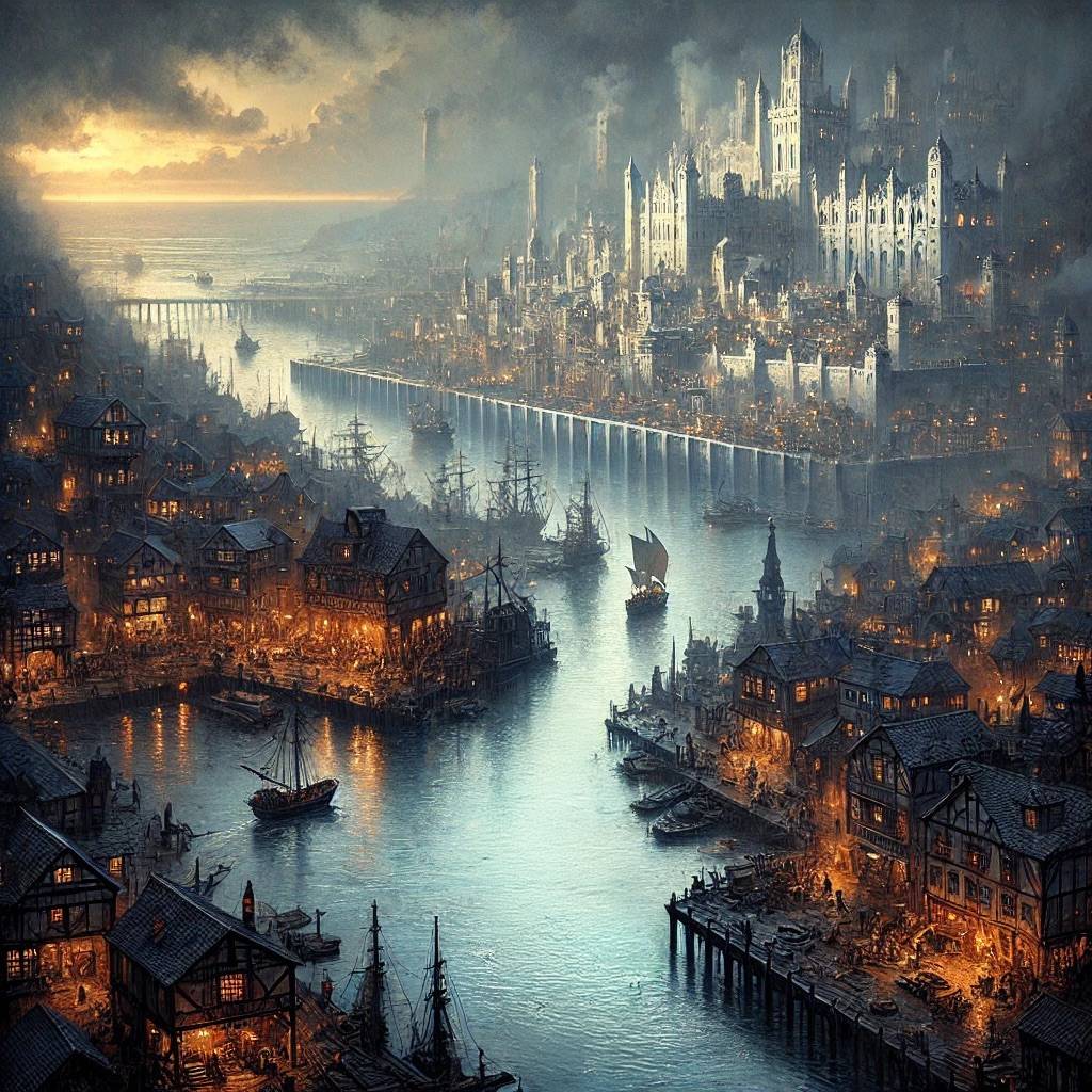 Driftmar is a city of contrasts, a place where the mundane and the extraordinary coexist in a delicate balance. The bustling heart of the merchant city is alive with activity, a cacophony of sounds and sights that draw people from all corners of Eldoria and beyond. Traders haggle over exotic goods—silks from distant lands, spices that tingle on the tongue, and jewels that sparkle like captured starlight. Ships, with their creaking hulls and billowing sails, dock in the crowded port, their crews eager to offload their cargo and spend their hard-earned coin in the city’s many taverns. The harbor is a sight to behold, sprawling out in a wide arc cradled by the city like two protective arms. Its waters, deep and treacherous in places, are calmed by a massive breakwater that stretches across the mouth of the crescent-shaped bay. This stone barrier, weathered by countless storms, shields the ships anchored within from the worst of the ocean’s fury. At the farthest edges of the bay, on the outermost points, stand two lighthouses, their twin beacons casting long fingers of light across the water, guiding vessels safely into the harbor. As dusk falls, the bay comes alive with the glow of lanterns, reflecting off the surface of the water like a thousand dancing stars. Tonight, the harbor and river docks are particularly busy. Ships from distant lands have docked, their decks laden with goods from across the seas. Among the usual crates of spices, silks, and exotic wares, one shipment stands out—a very large, heavy, long, and narrow crate that has drawn the attention of more than a few curious onlookers. Its contents remain a mystery, but its arrival has already sparked whispers among the dockworkers and merchants. The merchants of Driftmar, ever vigilant over their wares, keep a close eye on the unloading process, while the city guard patrols the docks and marketplace, ensuring the safety of both the goods and the people. The guards, clad in armor emblazoned with the city’s lighthouse and seagull crest, walk their rounds with practiced ease, their presence a constant reminder of the law in a city where wealth and trade are king. At the center of Driftmar, rising above the city like a sentinel, stands the castle of Lord and Lady Duskwood. The white marble castle is a grand structure, its towers piercing the sky, visible from almost every corner of the city. The Duskwoods are a charismatic couple, their influence reaching far beyond the castle walls. They are well-liked by the citizens of Driftmar, who speak of them with respect and admiration. Under their rule, the city has flourished, its markets bustling and its streets relatively safe. Yet, there is an air of mystery about them, a sense that not everything is as it seems within the castle’s stone walls. But Driftmar is not just a city of commerce and nobility; it is a city of secrets. Tucked away down a narrow alley in a quiet, old part of the city stands a shabby, unassuming building that conceals Night Raven Press—the secret headquarters of the Night Ravens Thieves Guild. From the outside, it's easy to overlook, just another aging structure among the countless others in this ancient city. But for those who know where to look, the building is far more than it seems. Within its worn walls, beneath the faded sign that reads Publishing House, weathered by the salty breeze, lies the heart of a network that has quietly shaped the fate of Driftmar for years. Inside, the atmosphere is warm and inviting, the air filled with the scent of ink and parchment. The open floor plan centers around a very large printing press, the heart of the operation, where the rhythm of the press is a constant, steady pulse. Around the room, there is the organized chaos of writers and artisans at work—scribes bent over manuscripts, artists crafting intricate illustrations, and editors poring over drafts. Yet, beneath this surface of bustling creativity lies a network of secret passages, known only to the guild. One such passage leads to a hidden guild hall, a vast, shadowed chamber where the Night Ravens gather to hold meetings and plan their next moves. Not far from the press, tucked into a corner of the city, lies the Roven's Roost Tavern. This tavern, operated by Orin Rovenshield, a retired adventurer with a sharp mind and a wealth of knowledge, is more than just a place to drink and be merry. It is a safehouse for the Night Ravens, a place where plans are made and secrets are shared within hidden chambers. The tavern’s walls are lined with mementos of Orin’s adventuring days, the most prominent of which is a shield emblazoned with a raven crest—the very symbol of the guild. The shield hangs above the bar, a silent reminder to those who know of the tavern’s true purpose. Orin himself is a man of few words but many stories. He spends his days tending the bar, his sharp eyes and ears picking up on every rumor and piece of gossip that passes through his tavern. For those who know how to ask, Orin is a wellspring of information about the goings-on in Driftmar and the inner workings of the Night Ravens. Beneath his gruff exterior lies a man deeply loyal to the guild and to the city he calls home. Yet, beneath this seemingly thriving city, there is a current of tension that runs deep, like a river of cold fear beneath the surface. That tension has only grown in recent weeks with the occurrence of three murders—each more chilling than the last. The most recent victim was a young woman, the daughter of a well-known merchant. Her body, like the others, was found with no obvious signs of violence, yet her face was frozen in a mask of sheer terror. It was as though the life had been drained from her, leaving only an empty shell behind. “Not a mark on 'er,” whispered one merchant to another in the marketplace, her voice low and trembling. “Poor lit'l lass looked like… like she’d seen som'fin from beyond. som'fin that took more than just 'er life.